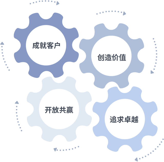 成就客户是一切决策的出发点,,,,创造价值是衡量所有工作的标准,,,,追求卓越是我们做事做人的态度,,开放共赢是我们的格局也是最终的结果。。价值观的齿轮环环相扣,,推动着组织里的每个人不断向前。。